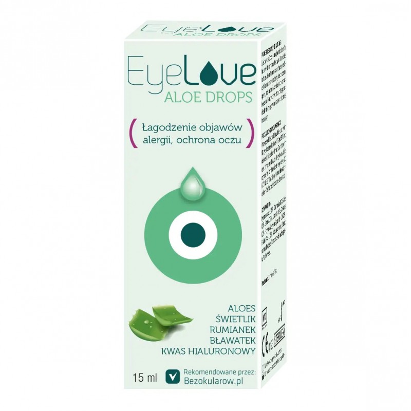 EyeLove Aloe Drops zawierają naturalne składniki, takie jak aloes, rumianek, hialuronian sodu, świetlik, oczar wirginijski i chaber, które działają łagodząco i nawilżająco, przynosząc ulgę nawet najbardziej zmęczonym i przesuszonym oczom.